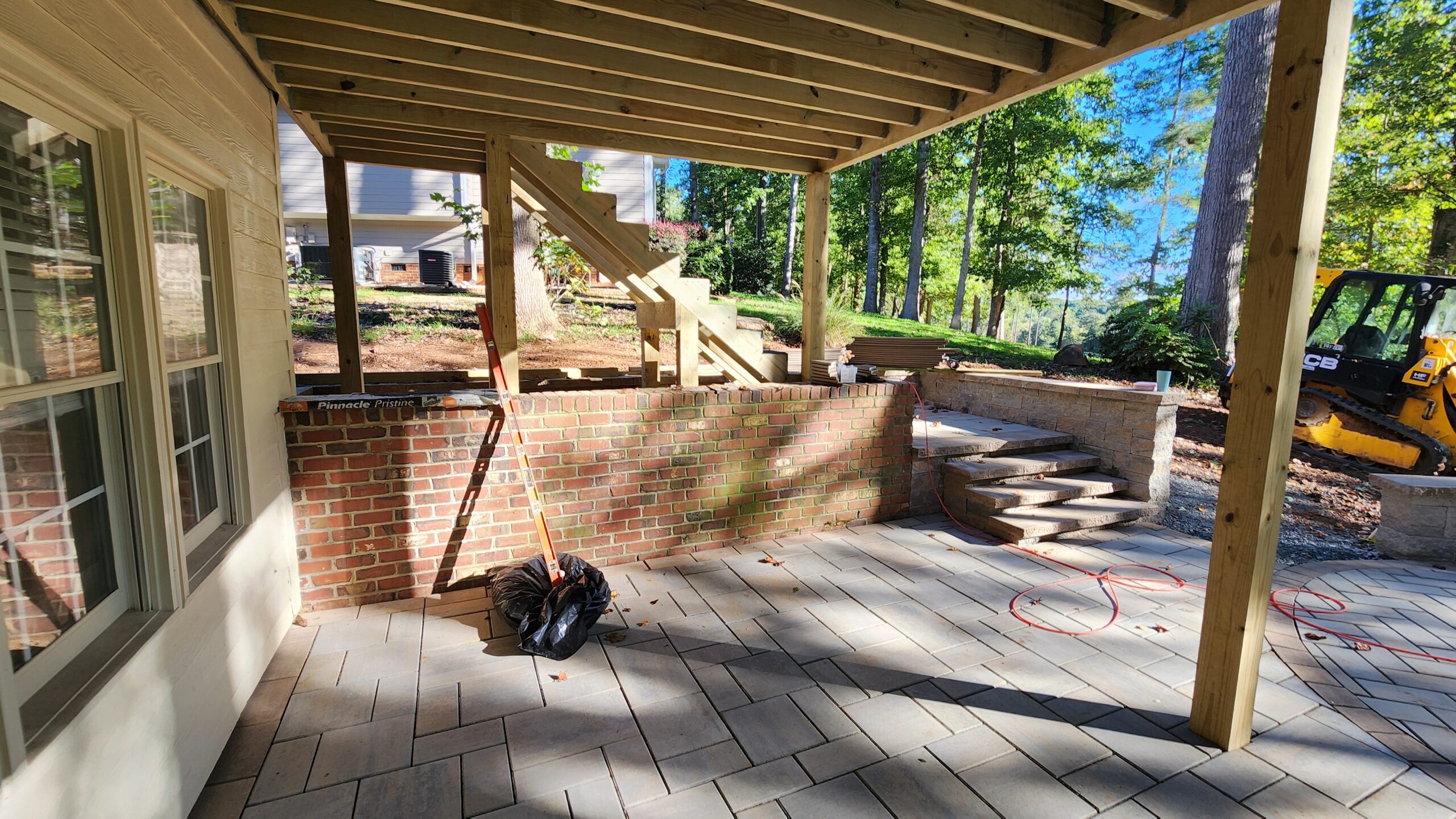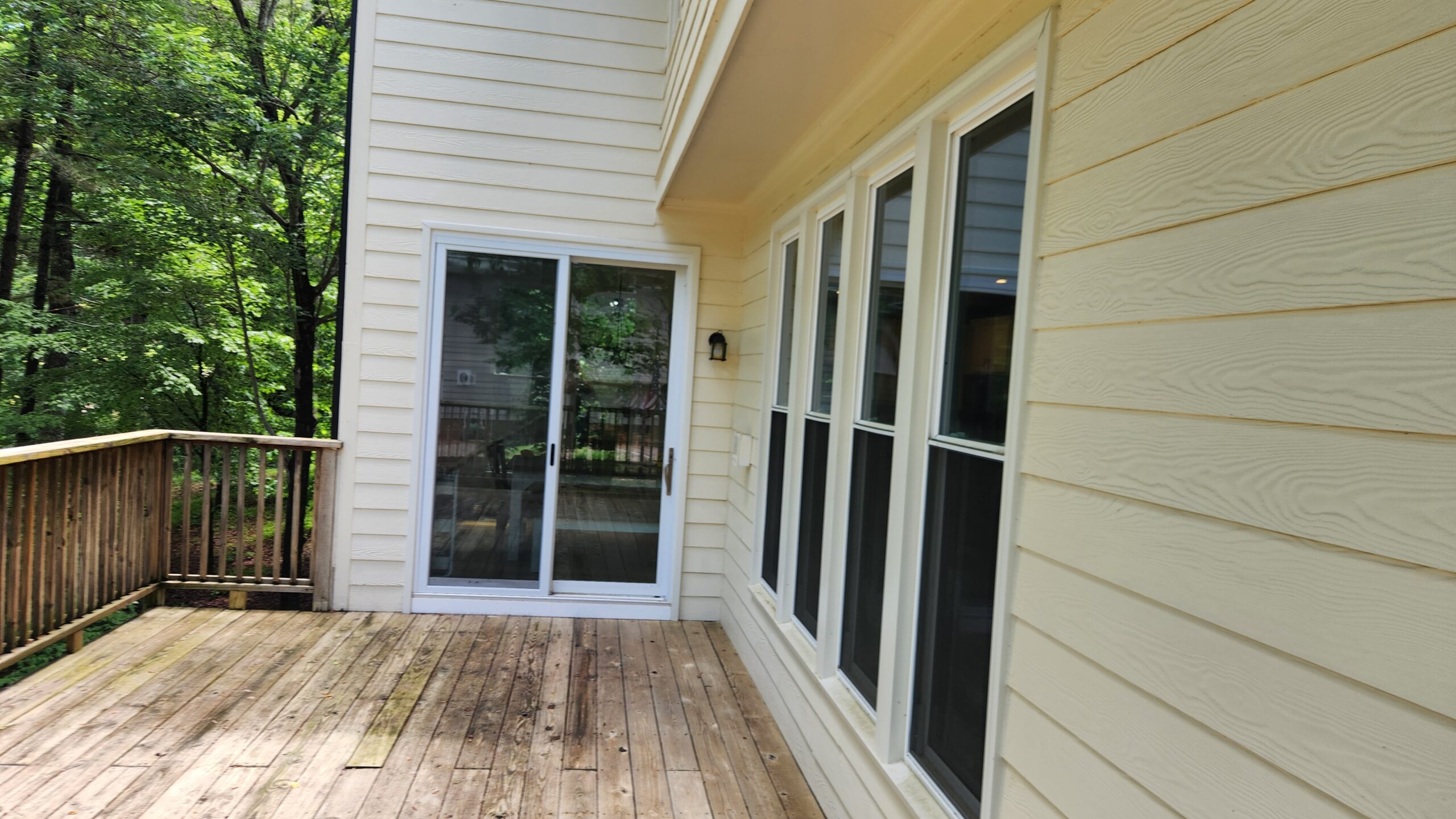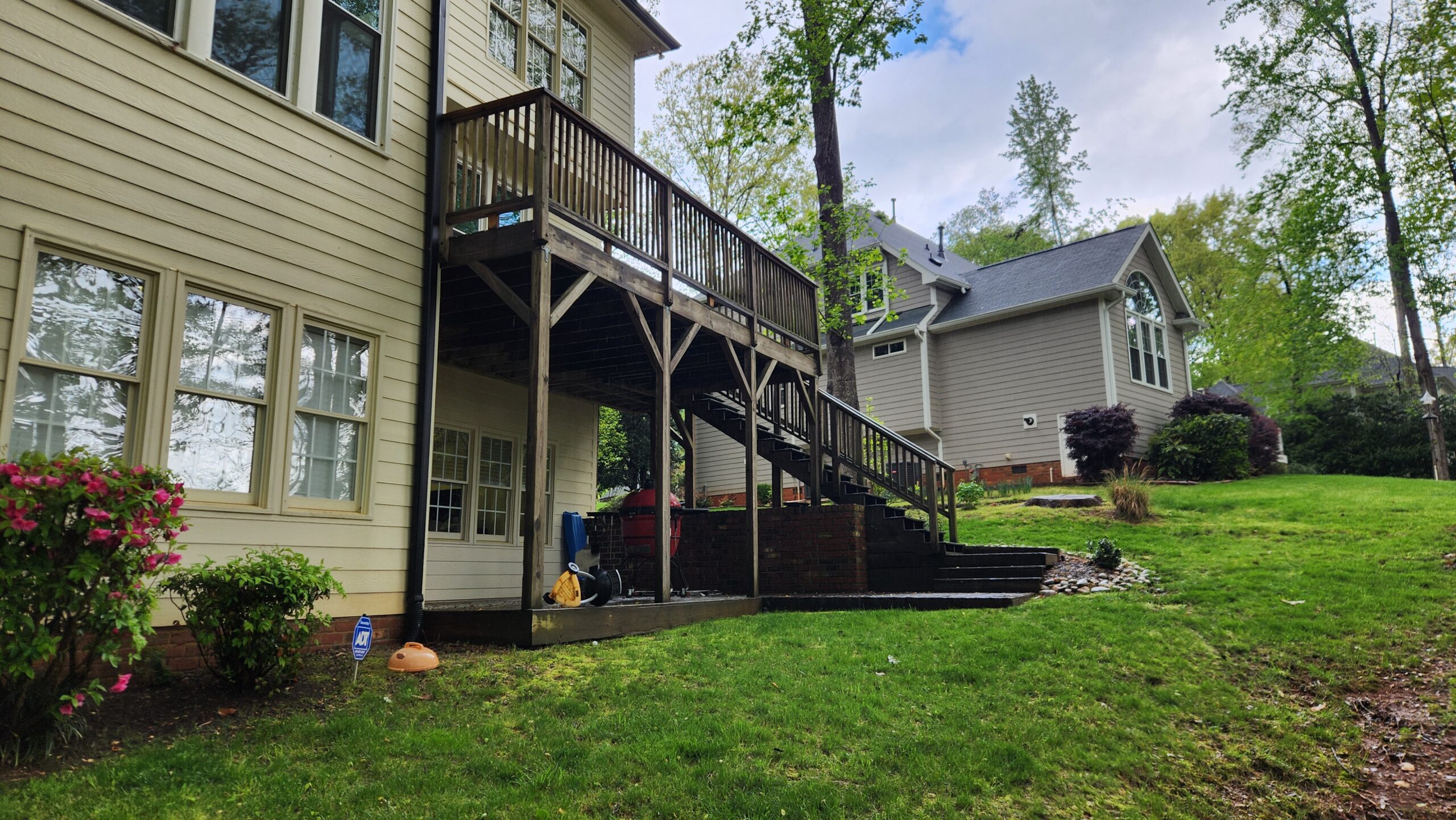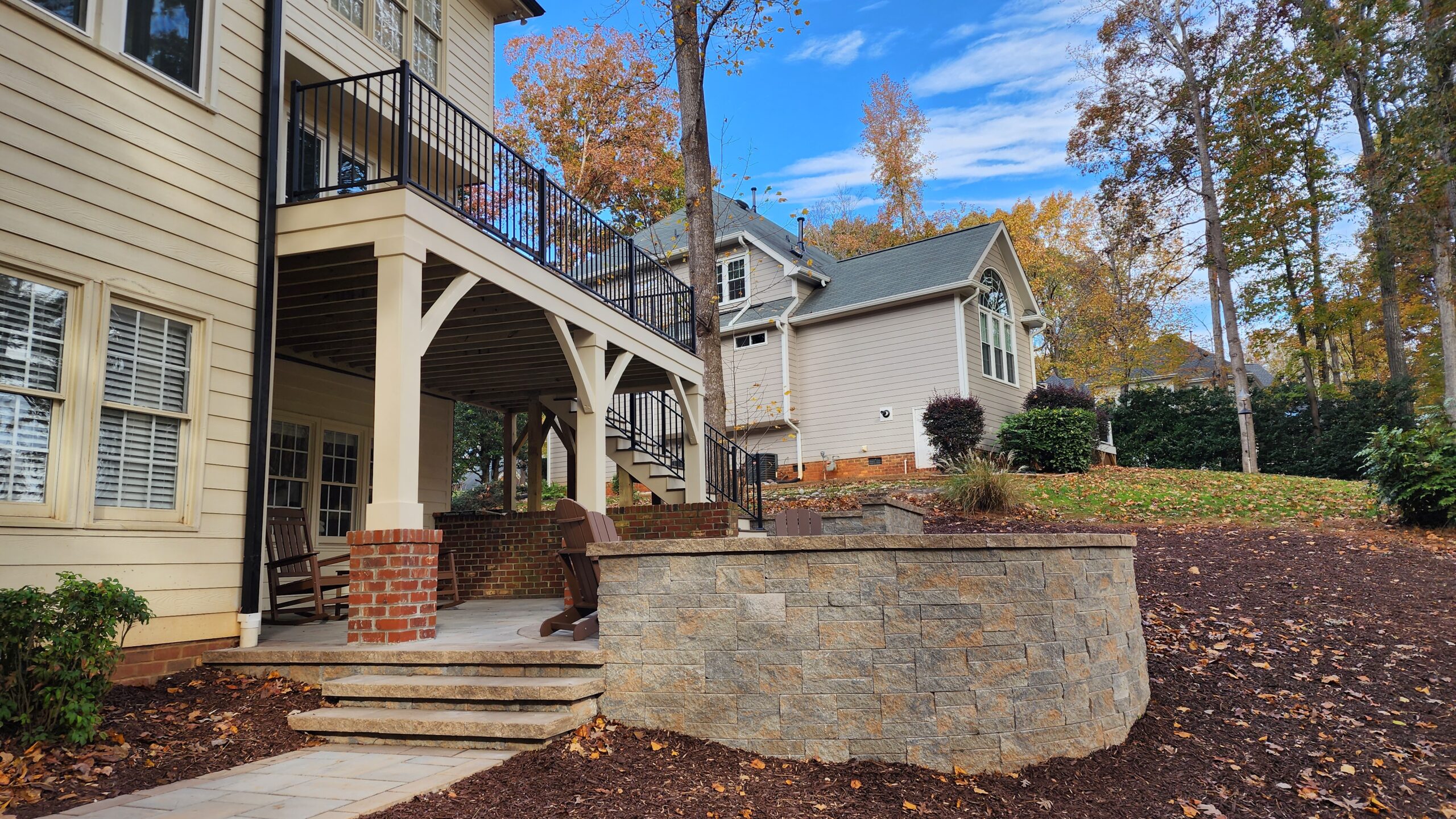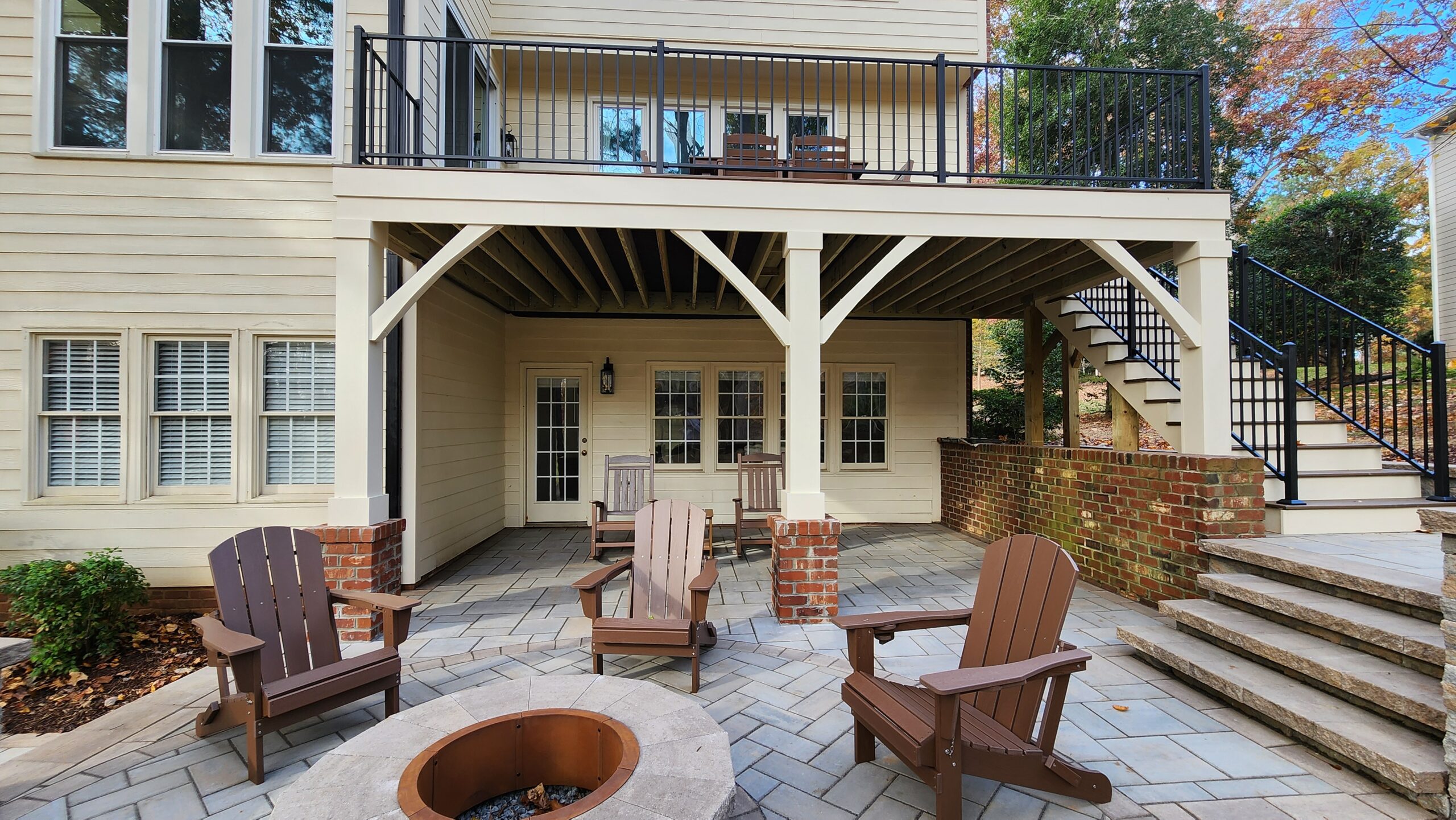 The original setup featured a second story wood deck as well as a basement-level floating deck.  As trusted deck builders in Holly Springs, we completely reimagined the space by installing a spacious stone patio at the lower level, creating a functional and inviting area that connects seamlessly to the walk-out basement (more on that in a future installment). Above it, we built a first-floor deck with a larger footprint than the original, providing sweeping views of the backyard and the golf course—a perfect space for relaxing or entertaining in comfort and style.