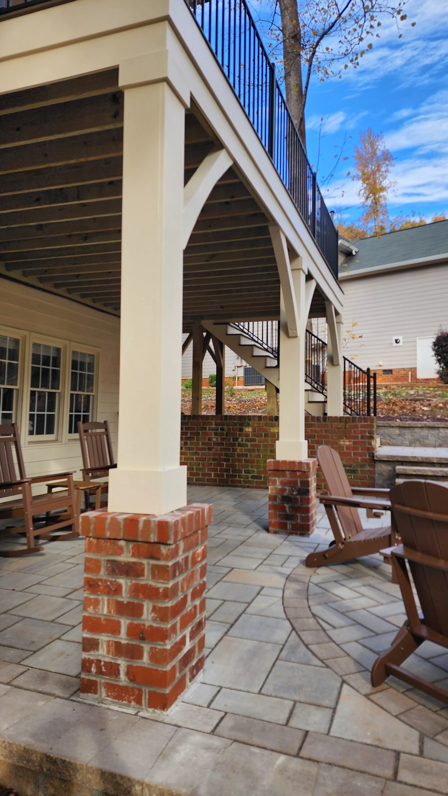 - Masonry Piers: To tie the new deck visually to the home’s design, our mason installed brick‑faced piers at the base of two deck posts. While they are strictly decorative, they matched the home’s brick exterior perfectly for a cohesive, high‑end finish.