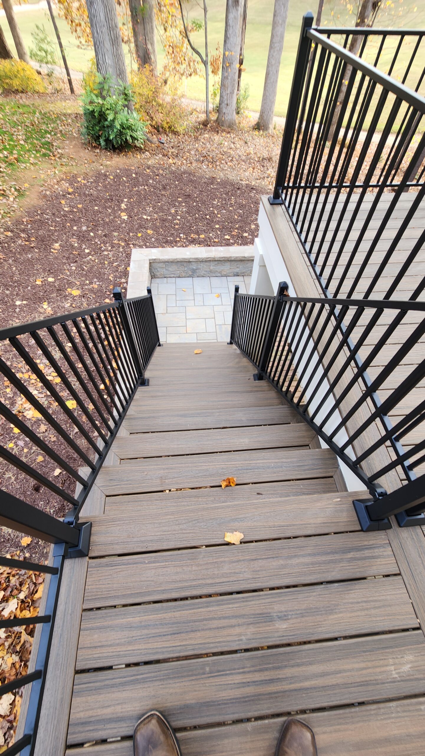 For safety and style, we installed a complete steel railing system by Fortress (FE 26 Iron), including both the top rail and vertical bars—one of the strongest and most reliable options on the market. Knee braces and engineered lateral bracing ensured the deck’s structural integrity, while the landing and stairs provided smooth, safe access down to the stone patio.